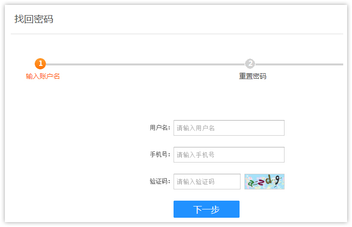 2、進入找回密碼頁,填寫您的用戶名和注冊時所用手機號,進入重置密碼頁,即可對您丟失的密碼進行重置。