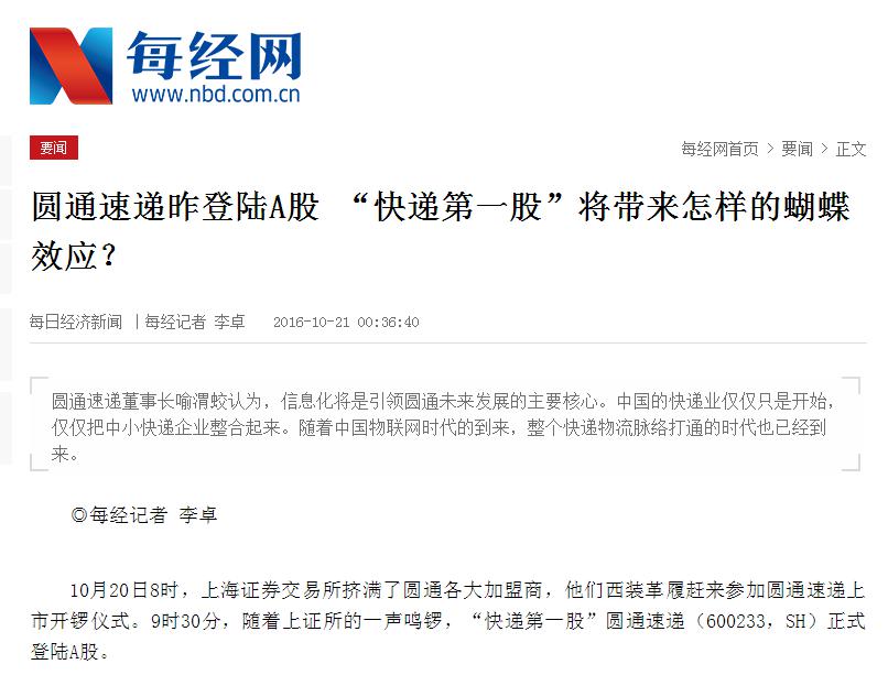 2016年10月20日上午9點30分,隨著在上海證券交易所一聲鳴鑼,圓通速遞股份有限公司正式登陸A股,成為中國快遞行業(yè)首家上市公司。 圓通速遞成功上市的消息引起了各大媒體的熱切關(guān)注。新華網(wǎng)、中華工商時報、新京報、每日經(jīng)濟新聞、第一財經(jīng)、經(jīng)濟觀察報、證券日報、新聞晨報、南方都市報、錢江晚報等近百家媒體對此紛紛進行宣傳報道,轉(zhuǎn)載量達千余次。 以下為部分媒體報道截圖: