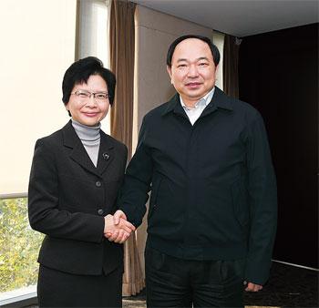 李國華與丁葉燕薇親切握手。□本報記者 王勇 攝