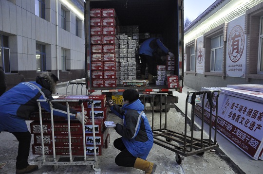 查干湖冬捕,即查干湖冬季冰雪漁獵,是一種極其傳統(tǒng)的漁業(yè)生產(chǎn)方式,始于史前、盛于遼金,延續(xù)至今千年未變,當(dāng)?shù)貪O民被稱為“最后的漁獵部落”。12月末到春節(jié)前是查干湖冬捕的黃金時間,漁民借助馬拉絞盤的力量在冰下行網(wǎng)捕魚,其盛大的場景每年都吸引著數(shù)萬國內(nèi)外游客前來觀看。2011年,中通吉林松原公司開通了查干湖承包區(qū),推出了“大美查干湖、中通鮮到家”的宣傳口號,并自行購置加厚紙箱、保溫箱等專業(yè)包裝材料,為寄遞客戶提供免費包裝服務(wù)。如今,查干湖分部承包區(qū)日發(fā)件量500票以上,名列松原公司首位,也為查干湖魚的對外銷售打開了一條新通道。